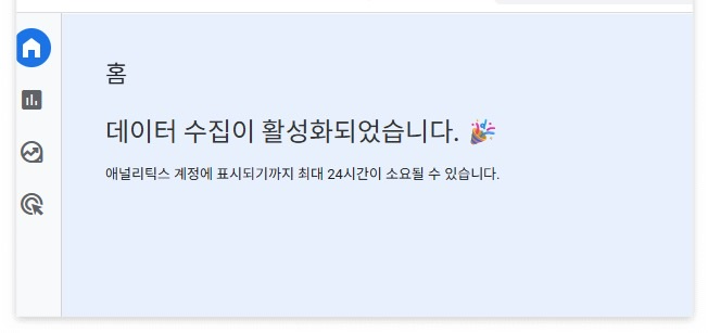애널리틱스 홈에 뜬 문구: “데이터 수집이 활성화되었습니다”