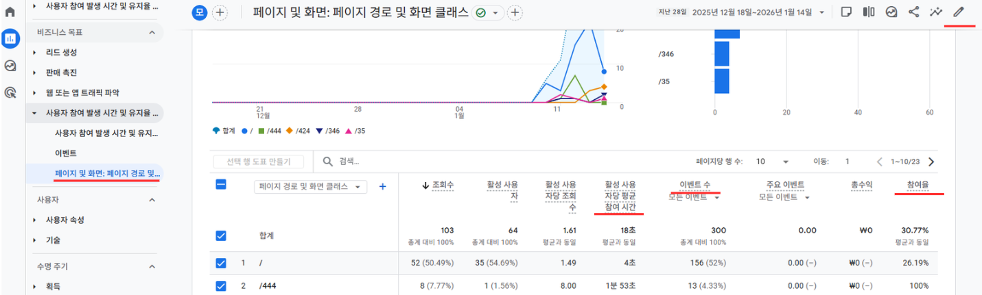 - 확인 경로 : 보고서→ 비즈니스 목표 → 사용자 참여 발생 시간 및 유지율 → 페이지 및 화면→ 아래 ①②③ 확인하기