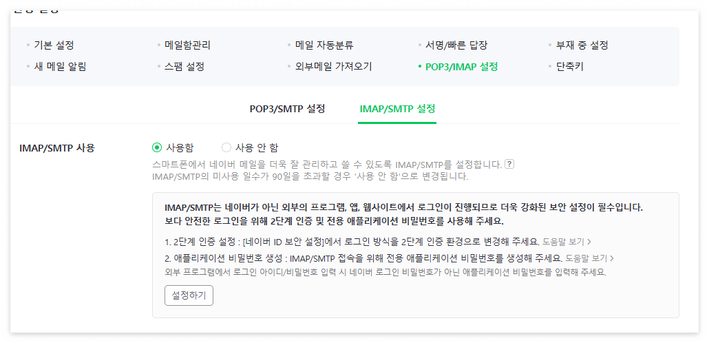 - IMAP/SMTP 설정 : '사용함'으로 변경 후,